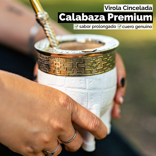 Mate Imperial (Calabaza) Blanco con Cuero Labrado - Virola Alpaca Cincelada